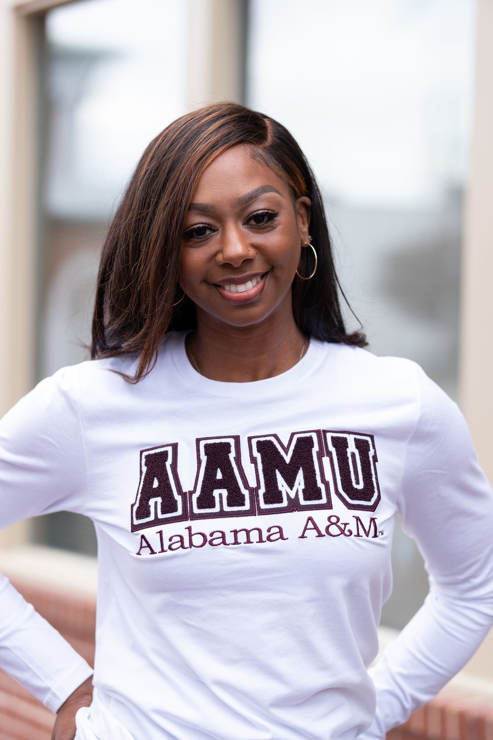 Dive into quality apparel with our AAMU long sleeve tee shirt adorned with lush chenille patches and superior embroidery threads. Elevating your wardrobe one thread a time.