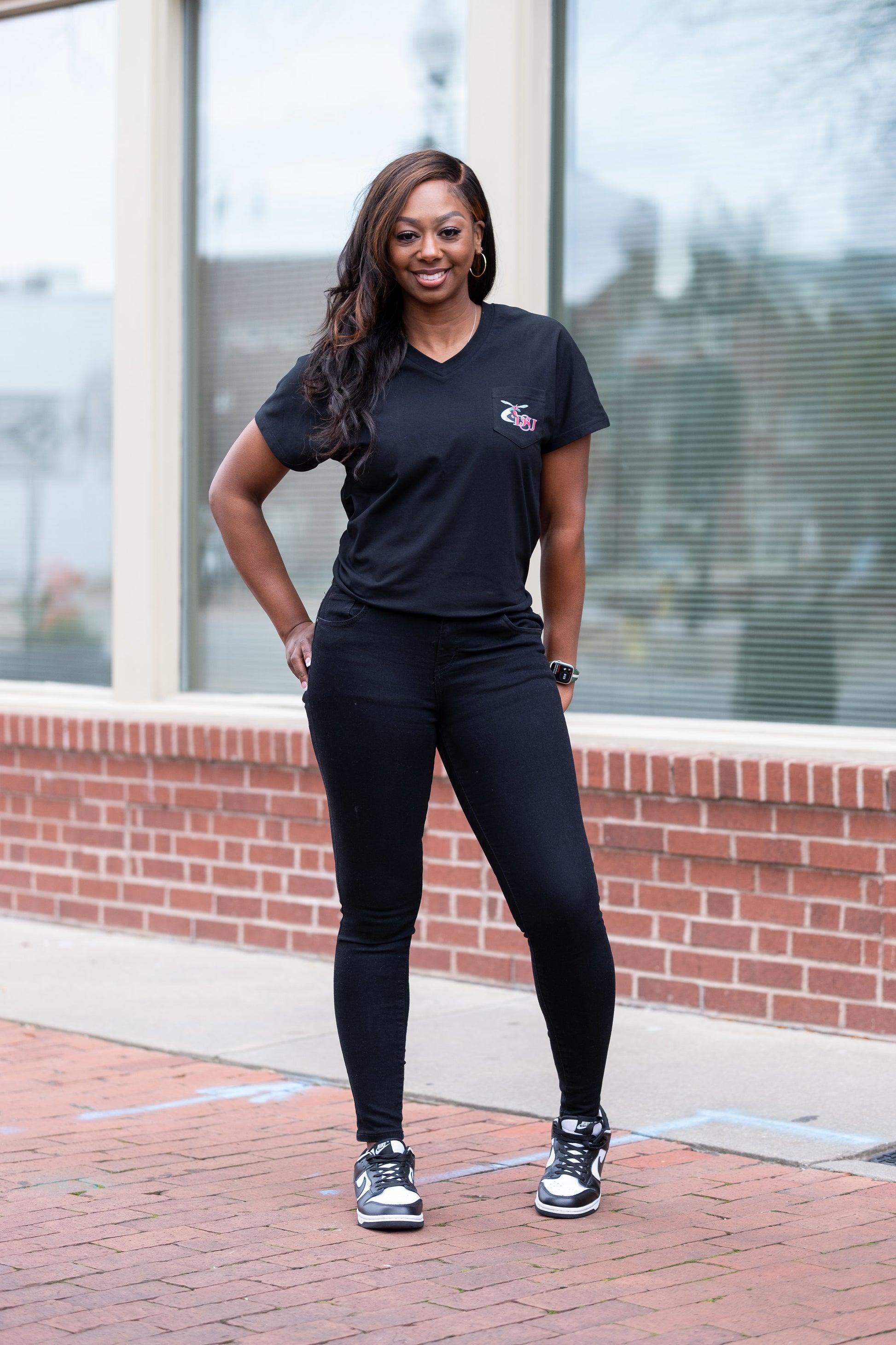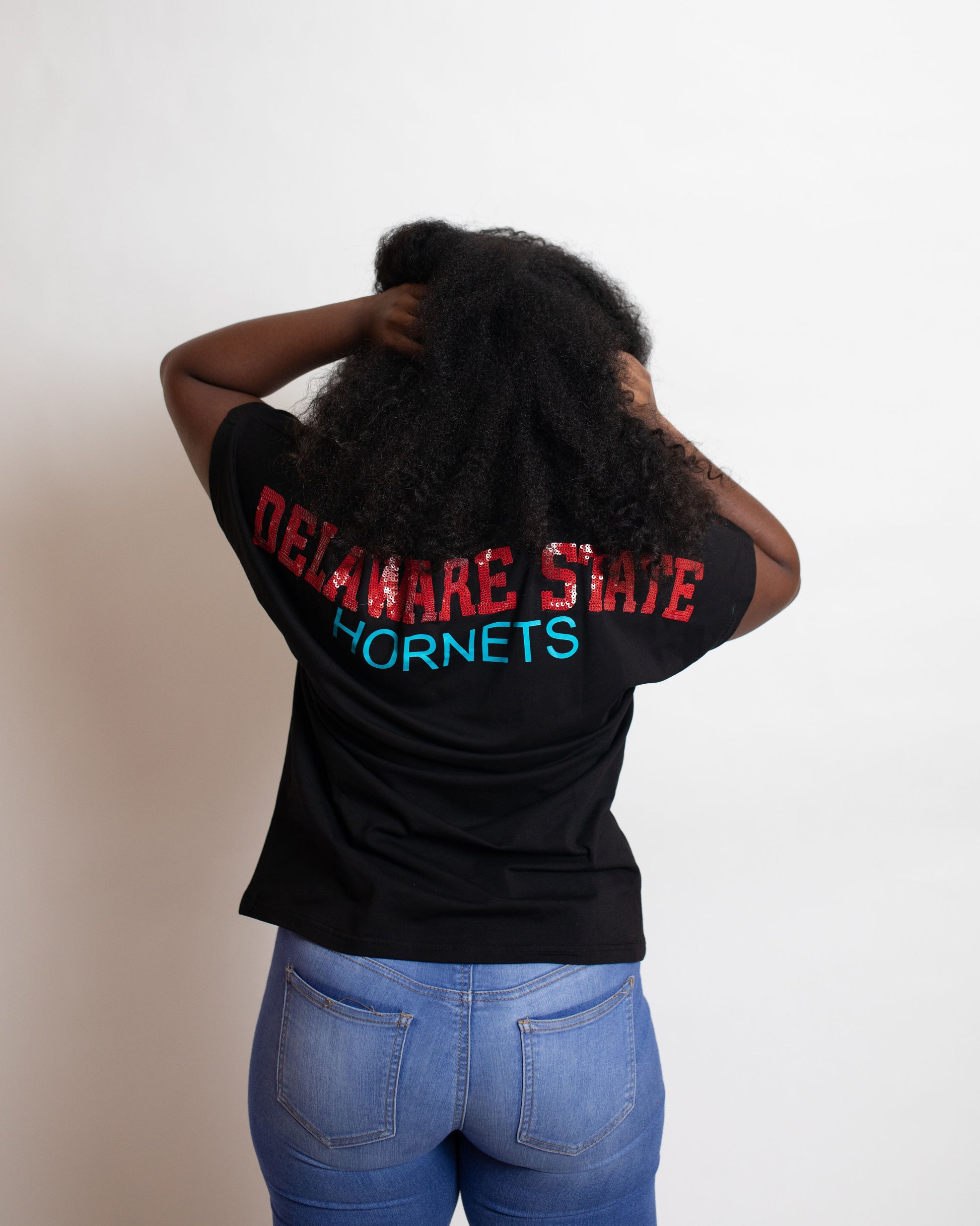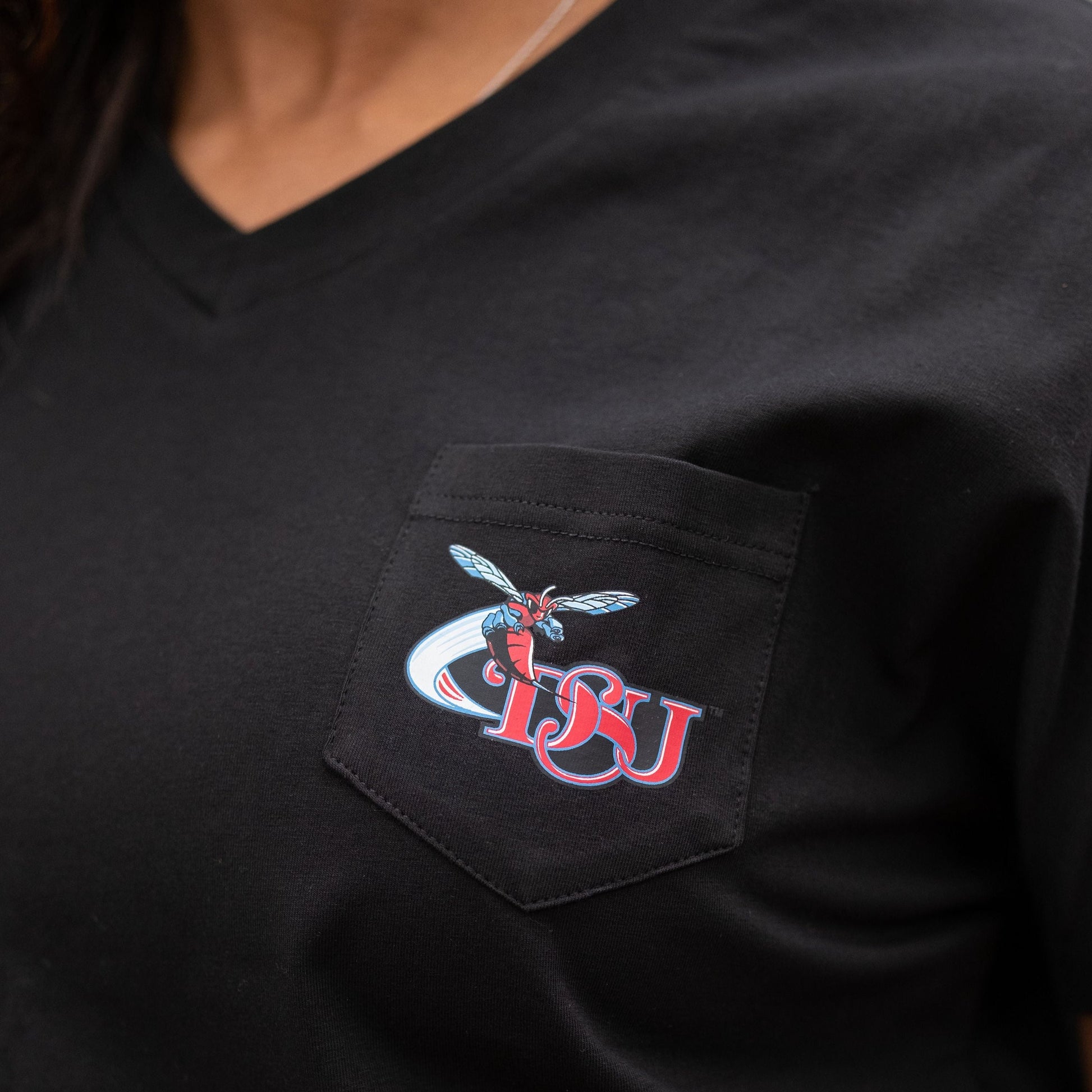 Comfort & quality. This dolman sleeve shirt is plush & smooth with comfortable stretch and excellent durability through repeated wears. Front of shirt pocket is adorned with beloved universities mascot. The icing on the cake... back of shirt has sparkling sequin with university's name and mascot name.