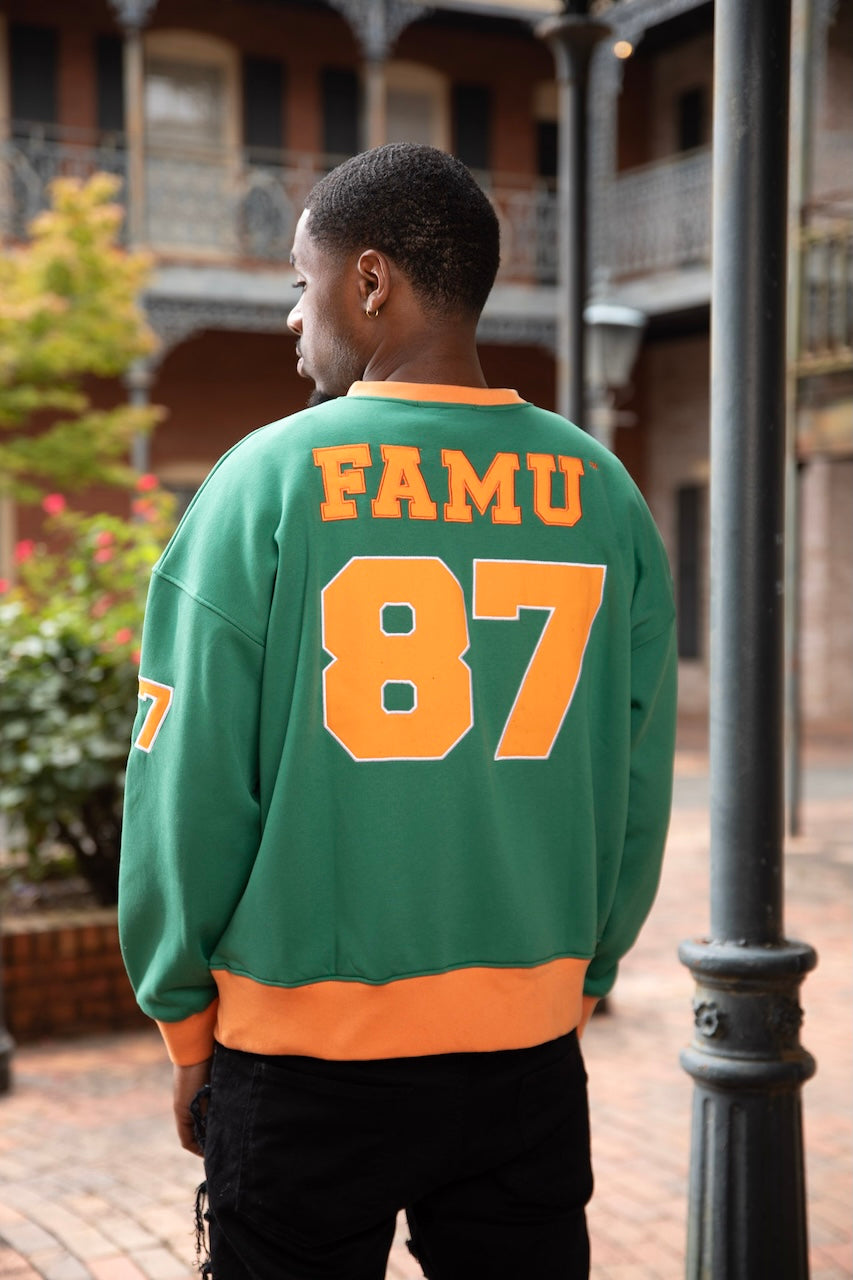 Featuring the iconic FAMU Rattler mascot and Florida A&M University lettering across the chest, along with varsity-style “87” patches on the sleeves, this sweatshirt stands out whether you’re on campus, at the game, or out in the city. The v-neckline and ribbed cuffs give it a polished, structured look while maintaining all-day comfort.