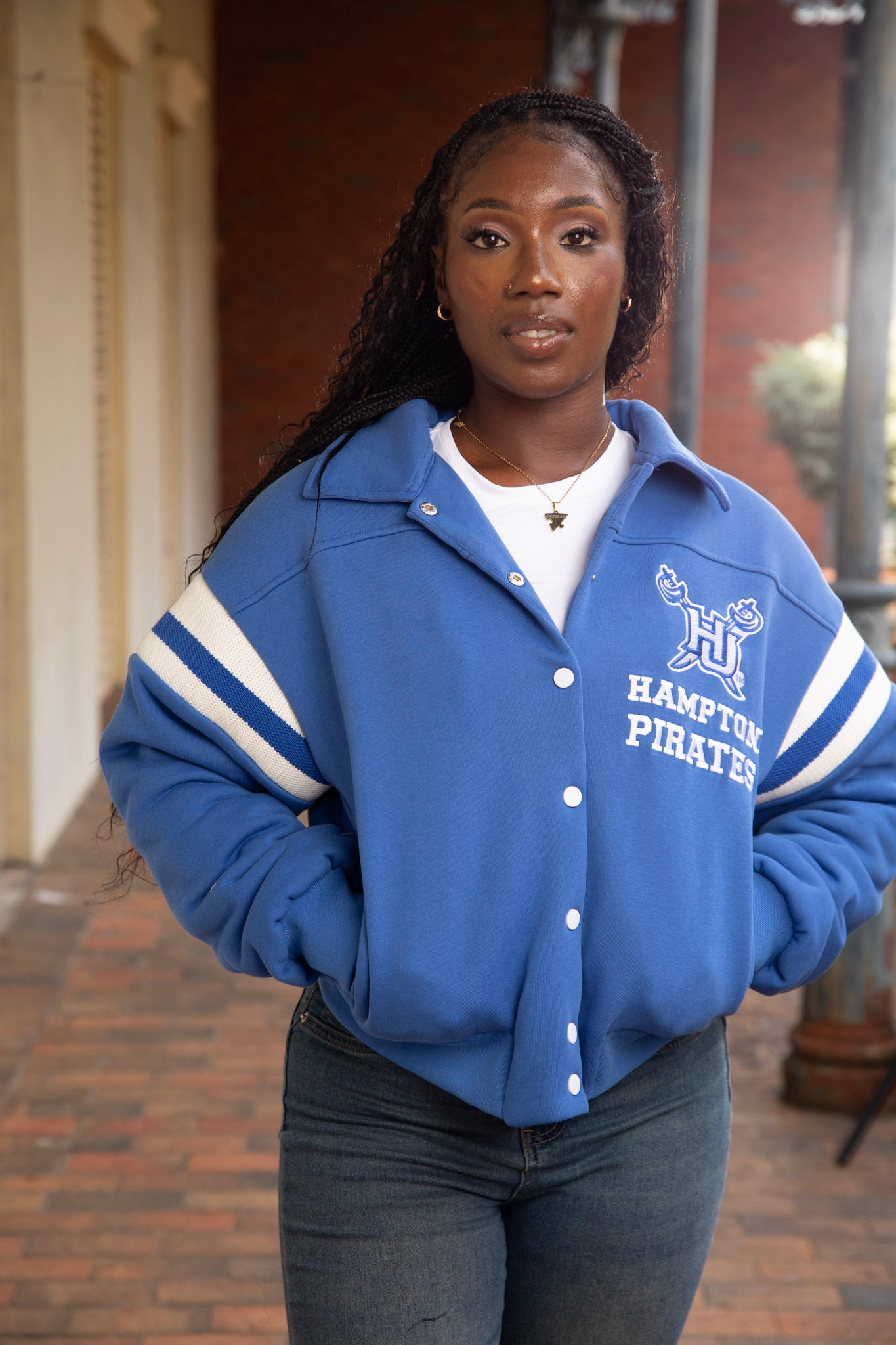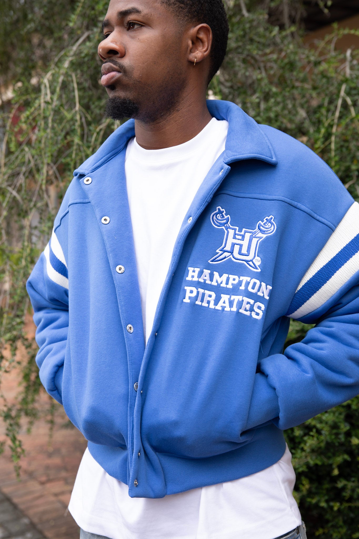 Make a statement in classic Pirate style with the Hampton Varsity Jacket. This timeless piece features a snap-button front, bold Hampton™ Pirates embroidery, and varsity-inspired sleeve stripes that deliver the perfect balance of tradition and trend.