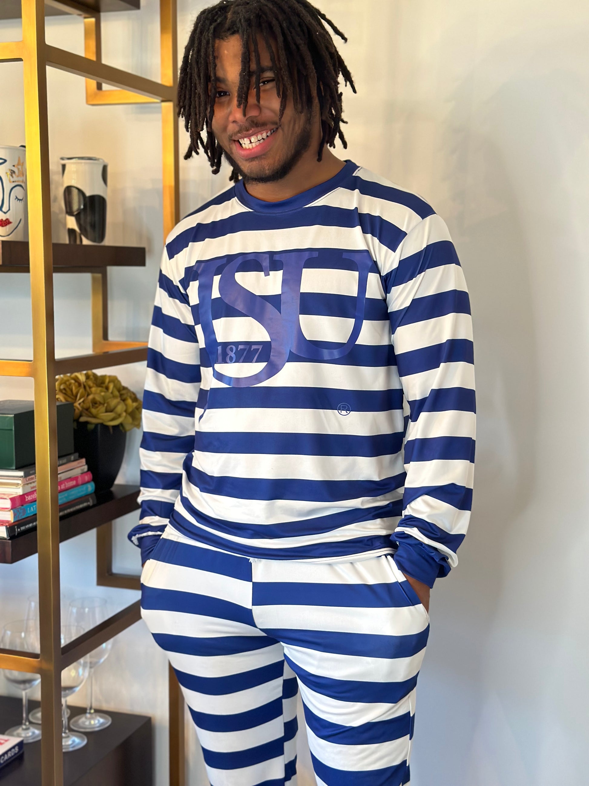 Our JSU 2 Piece Lounge Set was made for relaxing and comfortable lounging. This PJ top and bottom set features an allover blue & white striped print with large school insignia on front of shirt. With solid blue cuffs at the long sleeves and leg openings. Crew neckline, pants pockets with a unisex fit.