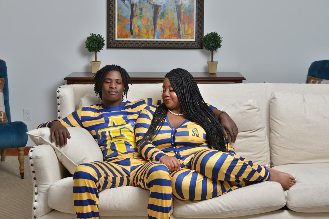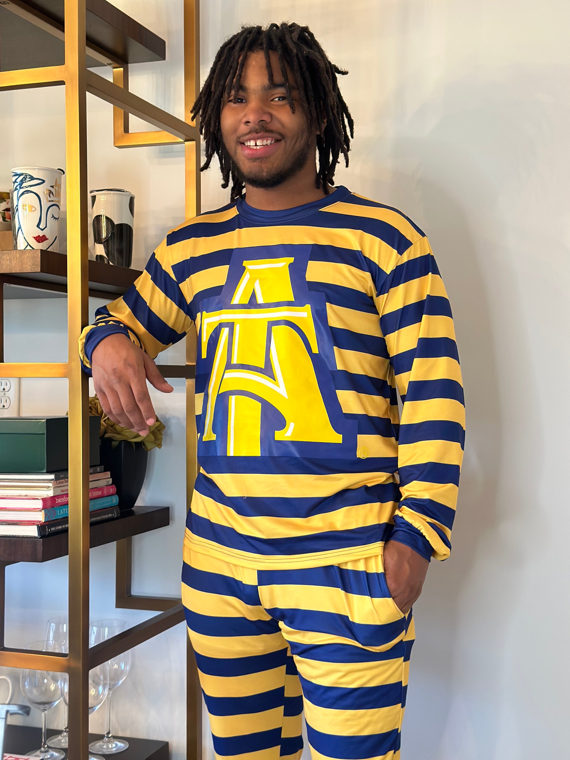 Our NCA&T 2 Piece Lounge Set was made for relaxing and comfortable lounging. This PJ top and bottom set features an allover blue & gold striped print with large school insignia on front of shirt. With solid blue cuffs at the long sleeves and leg openings. Crew neckline, pants pockets with a unisex fit.