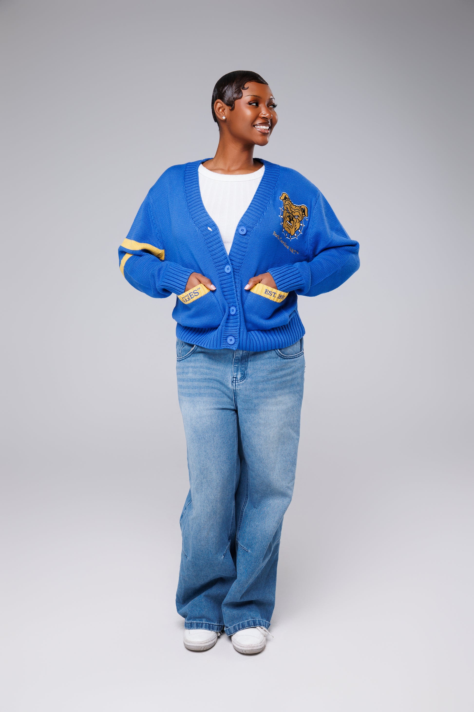 Show your Aggie Pride in elevated, heritage-inspired style with our North Carolina A&T Cardigan. This timeless knit features an embroidered Aggie Bulldog mascot logo on the left chest, North Carolina A&T State University embroidered along the pocket trim, and the university’s motto or spirit slogan beautifully stitched across the back — a bold tribute to NCAT’s proud legacy.
