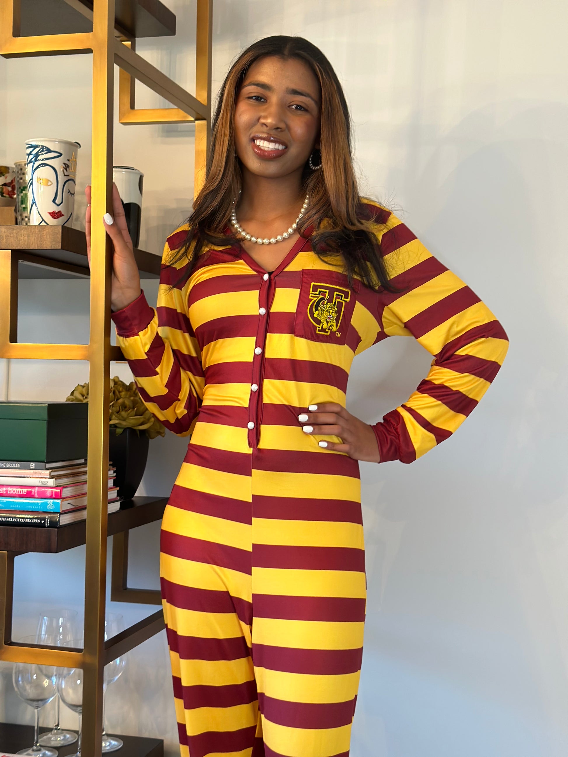 Our Tuskegee PJ onesie was made for relaxing and comfortable lounging. This knit number features an allover maroon and gold striped print. Pearl buttons down front with solid maroon cuffs at the long sleeves and leg openings. V neckline. Left pocket embroidered with school name. (embroidery cannot be customized)