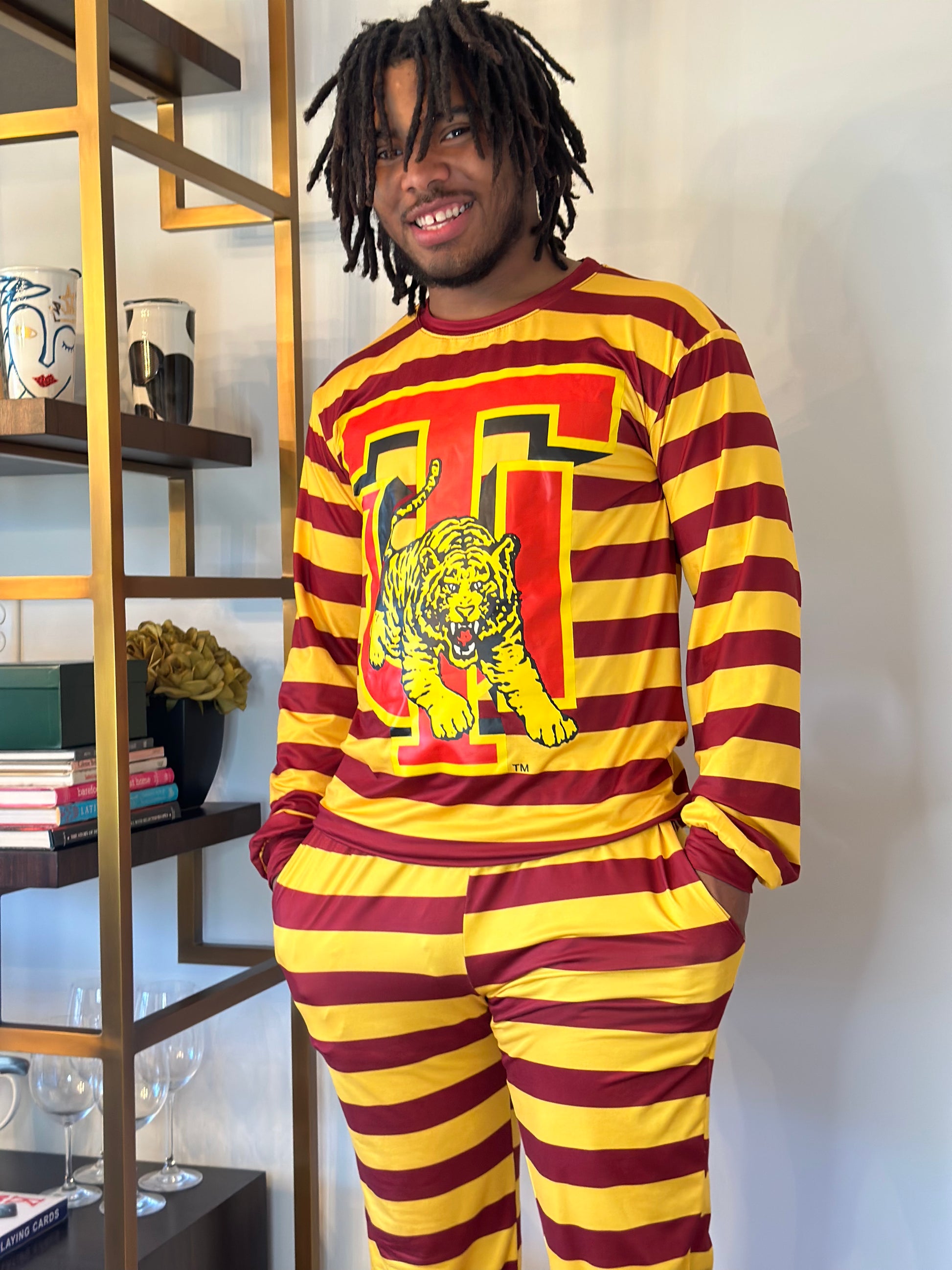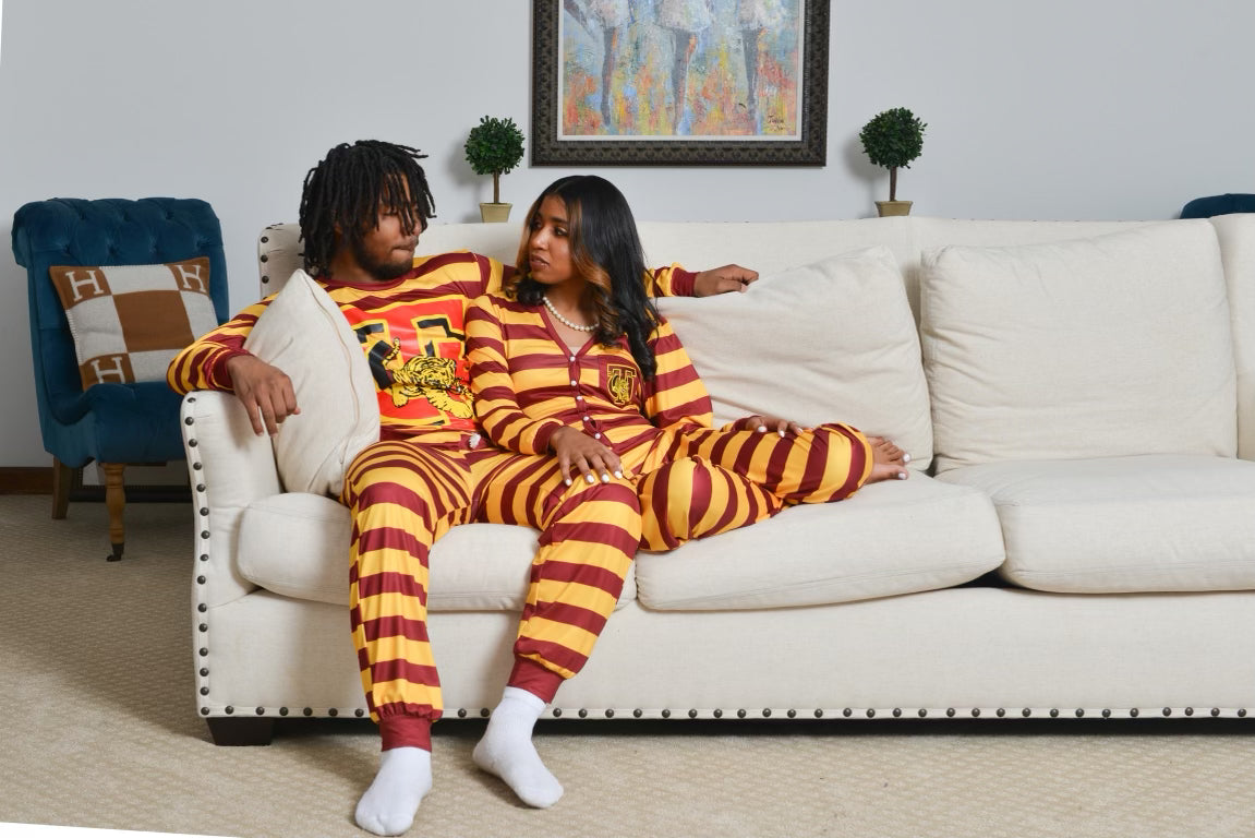 Our Tuskegee 2 Piece Lounge Set was made for relaxing and comfortable lounging. This PJ top and bottom set features an allover maroon & gold striped print with large school insignia on front of shirt. With solid maroon cuffs at the long sleeves and leg openings. Crew neckline, pants pockets with a unisex fit.